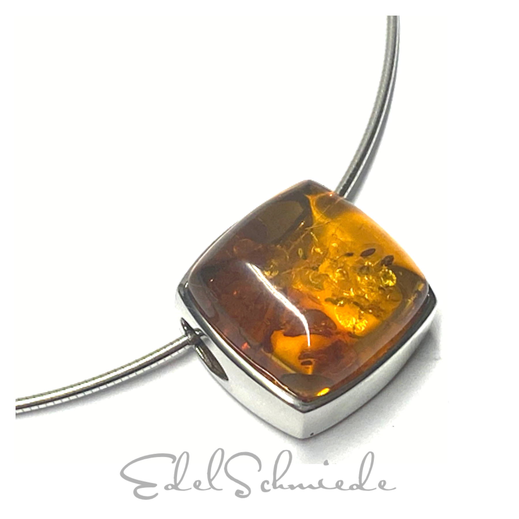 Dieser Kettenanhänger ist aus 925/- Sterling Silber gefertigt und wurde abschließend, als Anlaufschutz, rhodiniert. Er hat einen wunderschönen, eckigen Bernsteine eingesetzt. Die Öffnung für die Kette verläuft direkt durch den Anhänger. Hier kann eine Kette Ihrer Wahl eingefädelt werden, trotzdem ist die abgebildete Kette im Lieferumfang enthalten. Diese wird verschlossen mit einem stabilen Karabiner und einer Gegenöse.