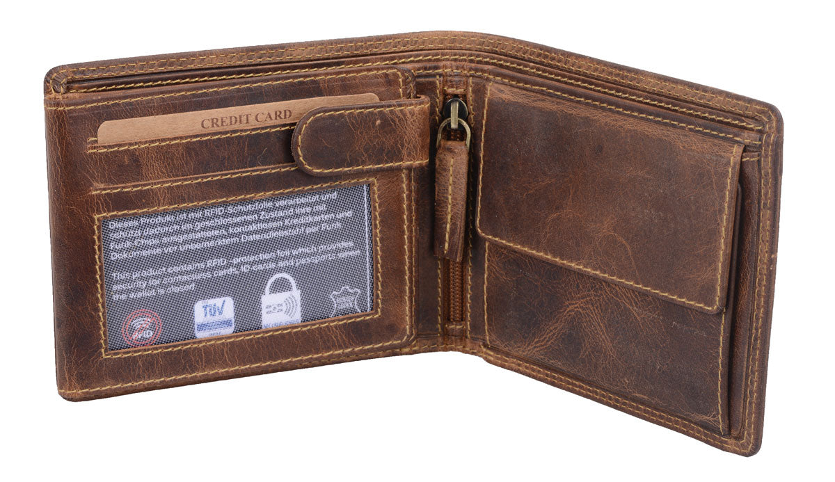 Das große Leder-Kleingeldfach ist stabil verarbeitet und bleibt auch bei häufiger Nutzung formstark. Der integrierte Mittelreißverschluss schützt weitere wichtige Dokumente oder gefaltete Scheine. Das geteilte Scheinfach sorgt dafür, dass Banknoten übersichtlich getrennt werden können.