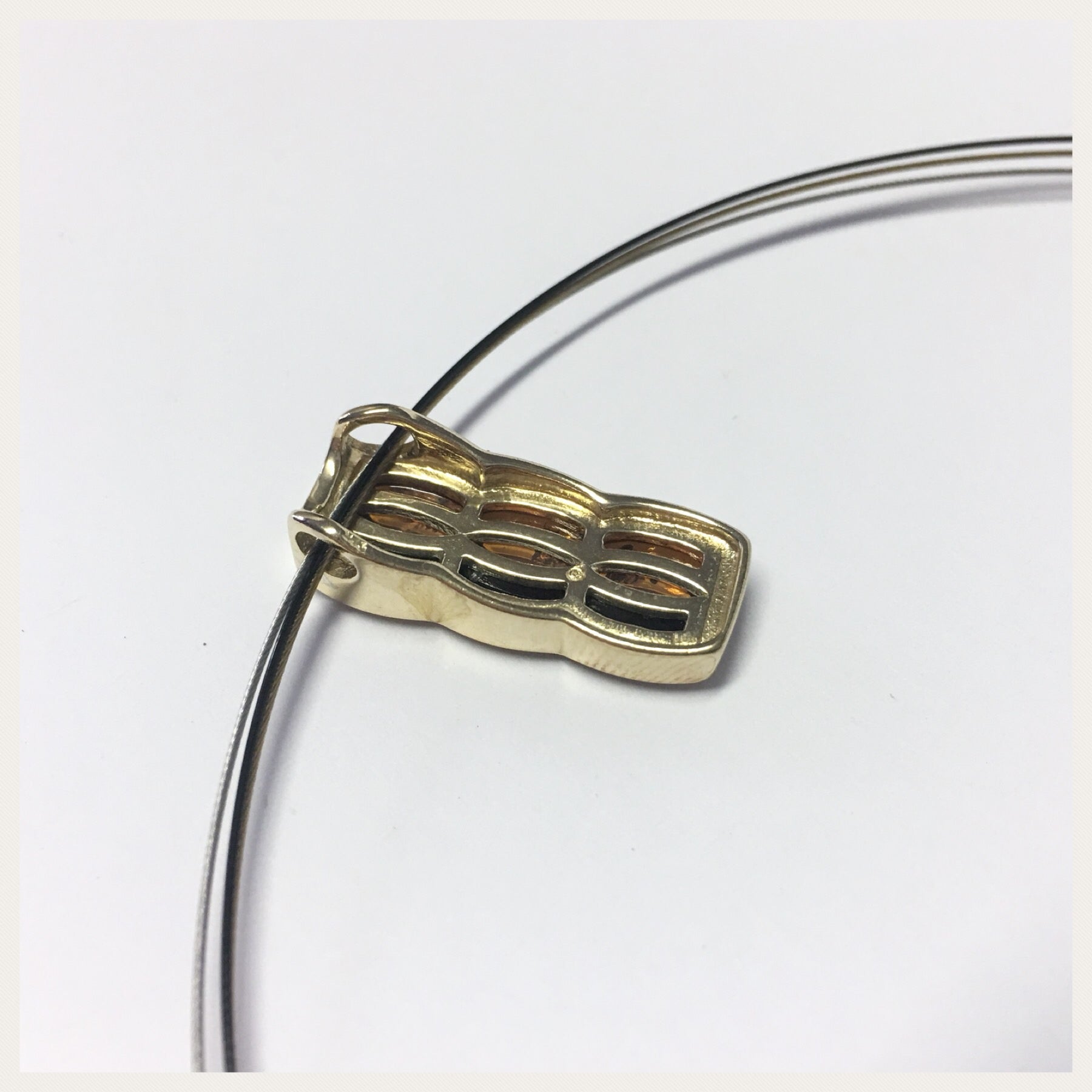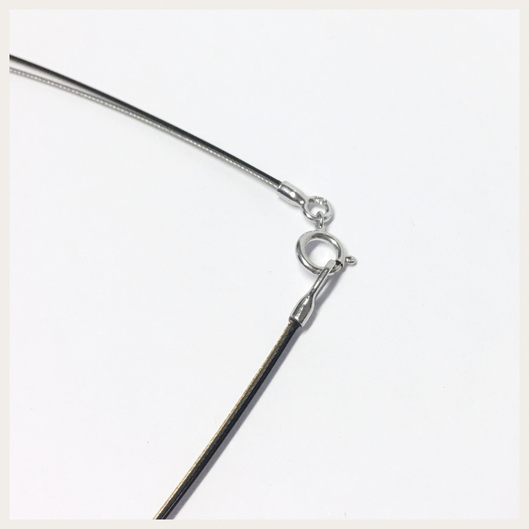 Die Öffnung für die Kette befindet sich direkt am Anhänger und ist fest integriert. Hier kann eine Kette Ihrer Wahl eingefädelt werden, trotzdem ist die abgebildete Kette im Lieferumfang enthalten. Der haslreif besteht aus 2 Strängen Stahlseil und wird verschlossen mit einem Federring und einer Gegenöse.