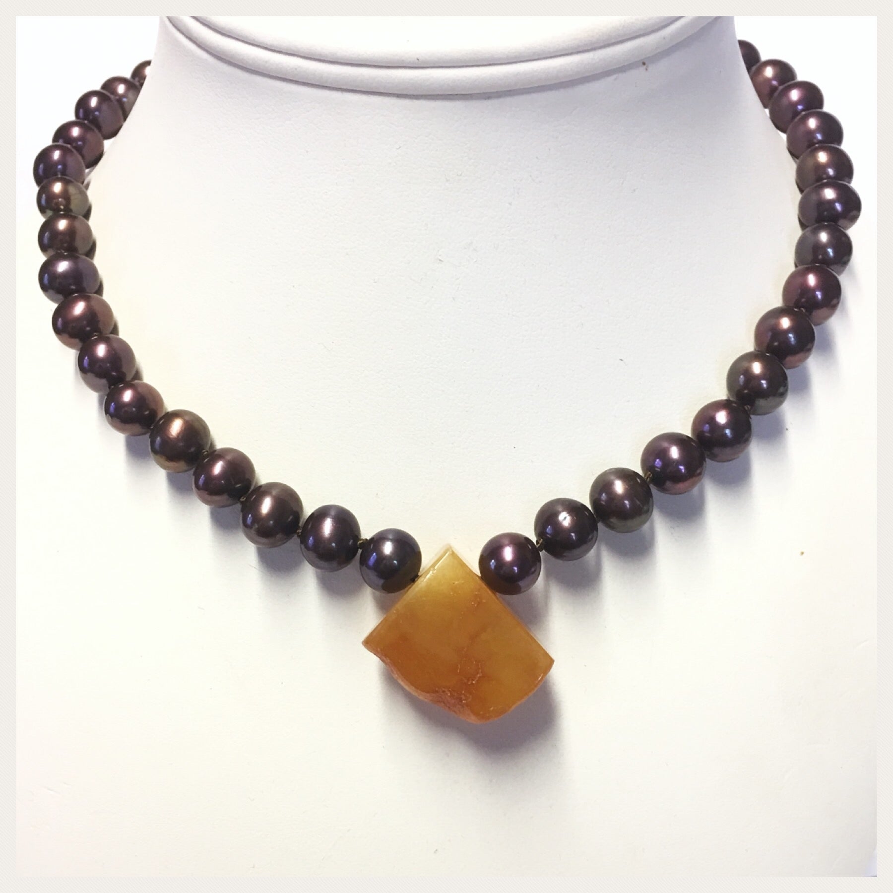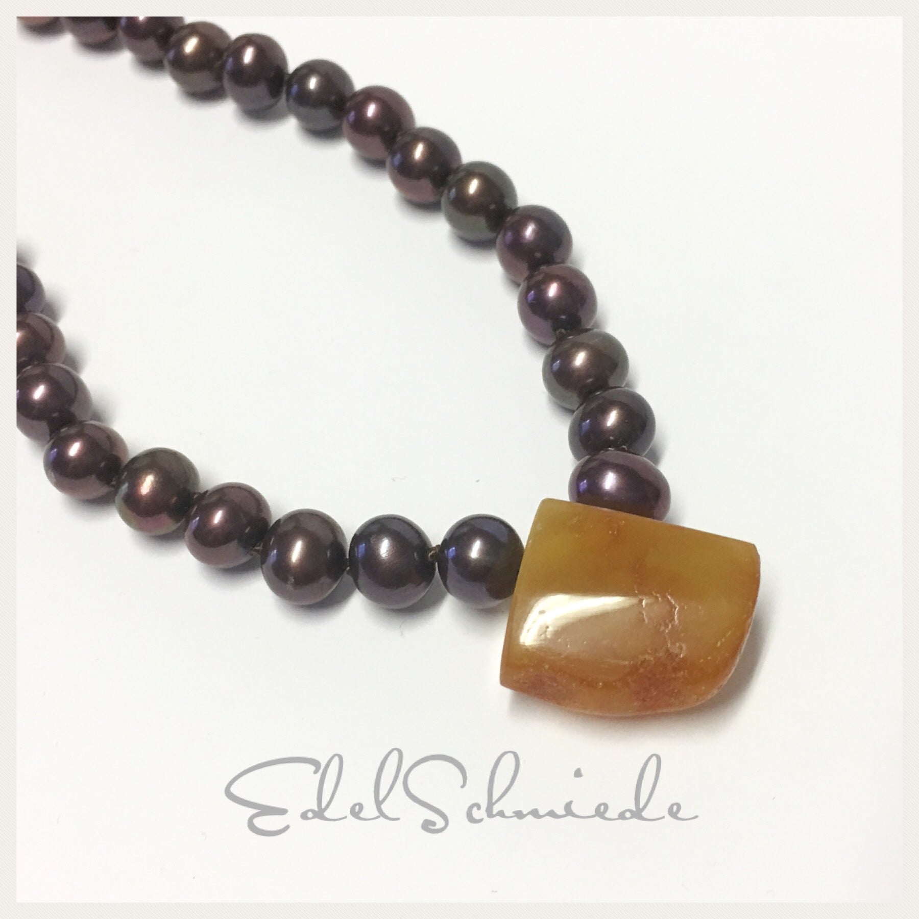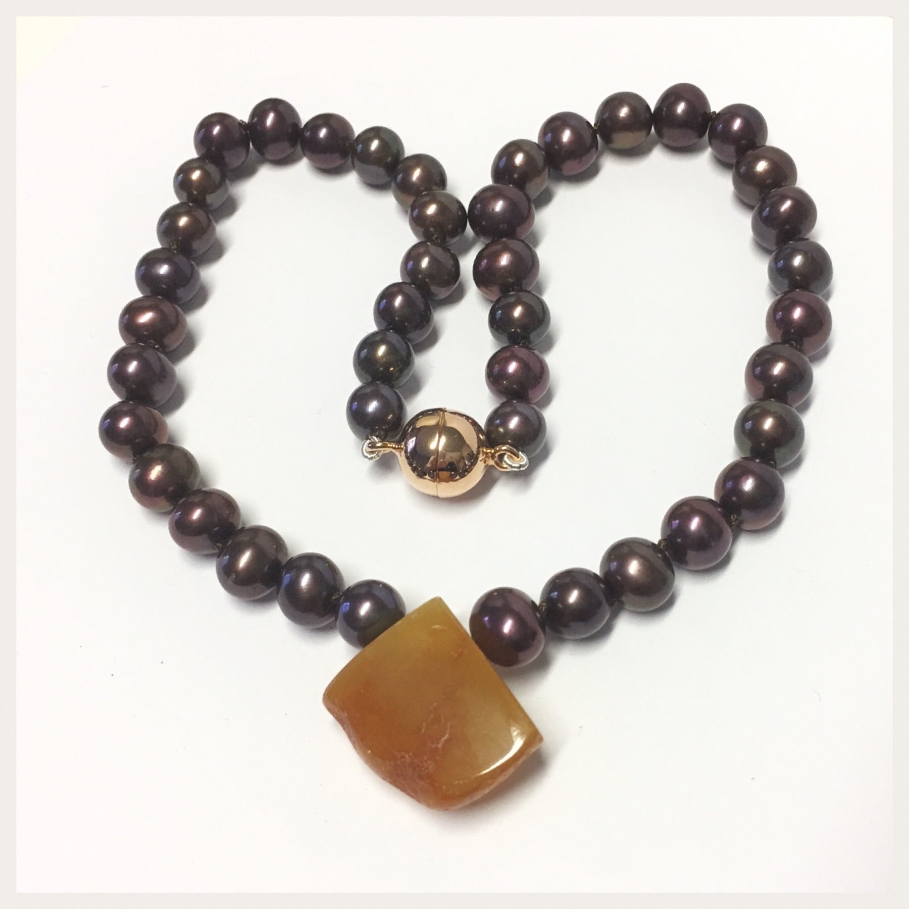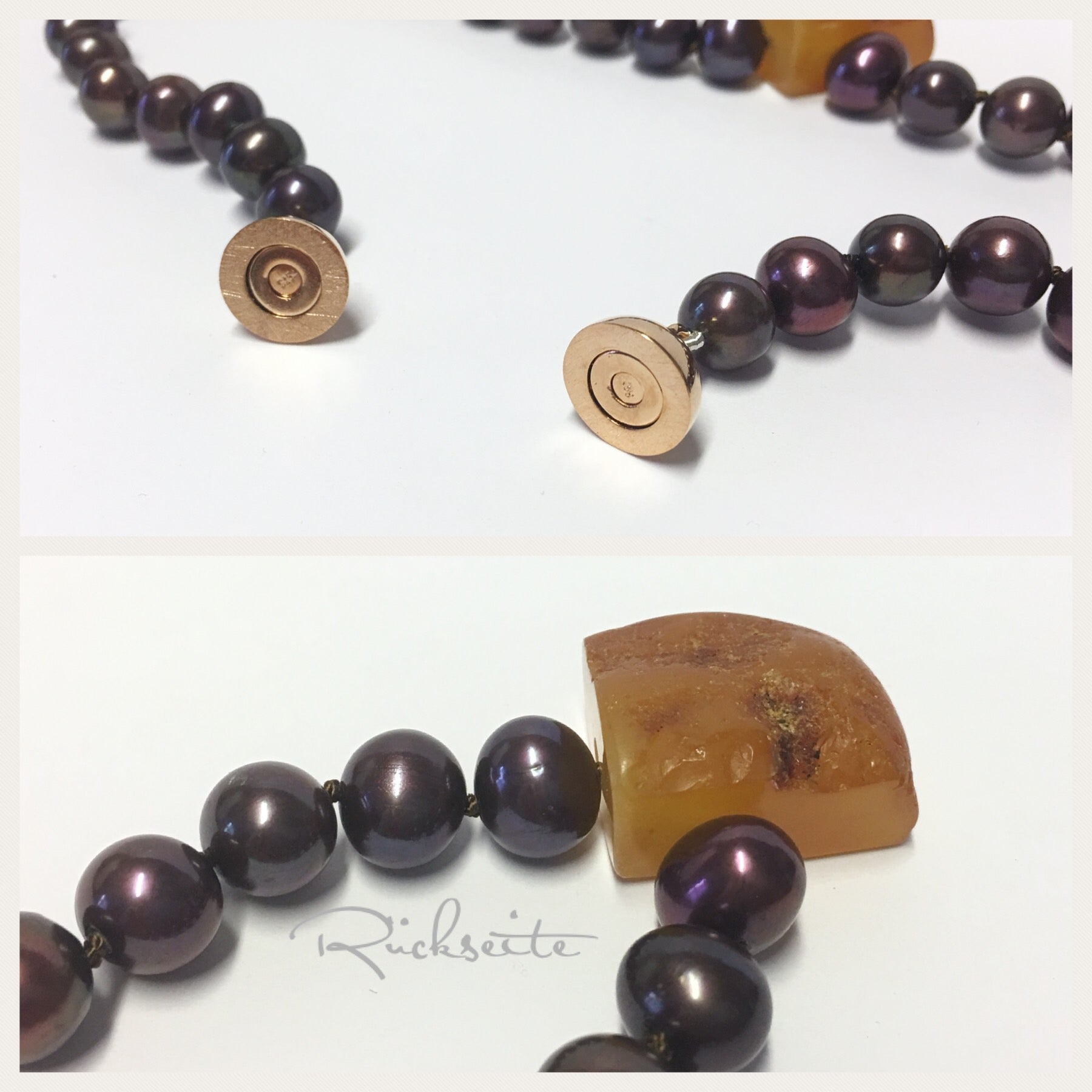 Diese Perlenkette ist von Hand geknotet und hat einen starken Magnetverschluß aus 925/- Sterling Silber rosévergoldet als Verschluß. Mittig eingefädelt ist ein herrlicher Bernstein, der von hand geschliffen wurde und in diese ausgefallene Form gebracht wurde. Er ist absoluter Hingucker bei diesem Collier und ein echtes Einzelstück.