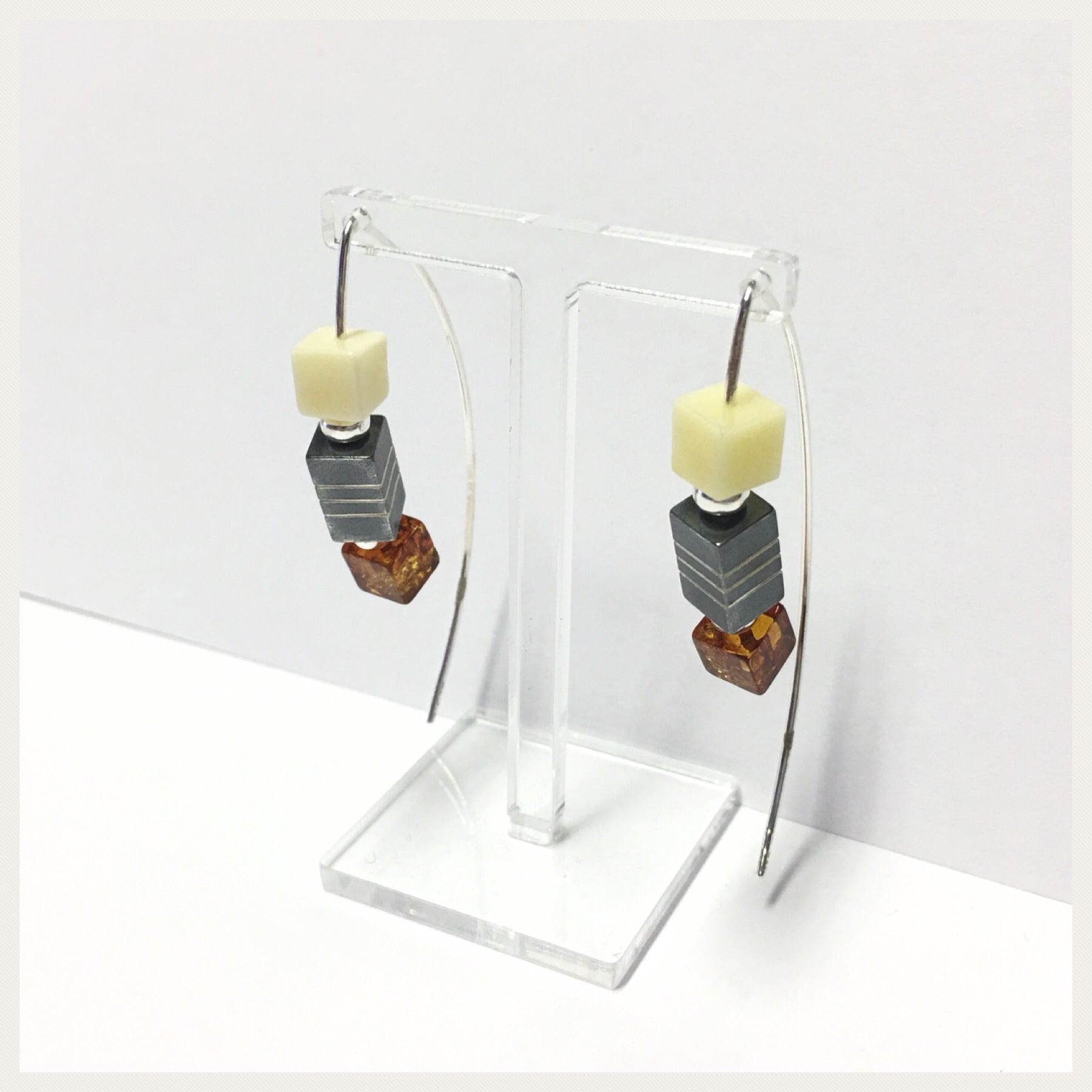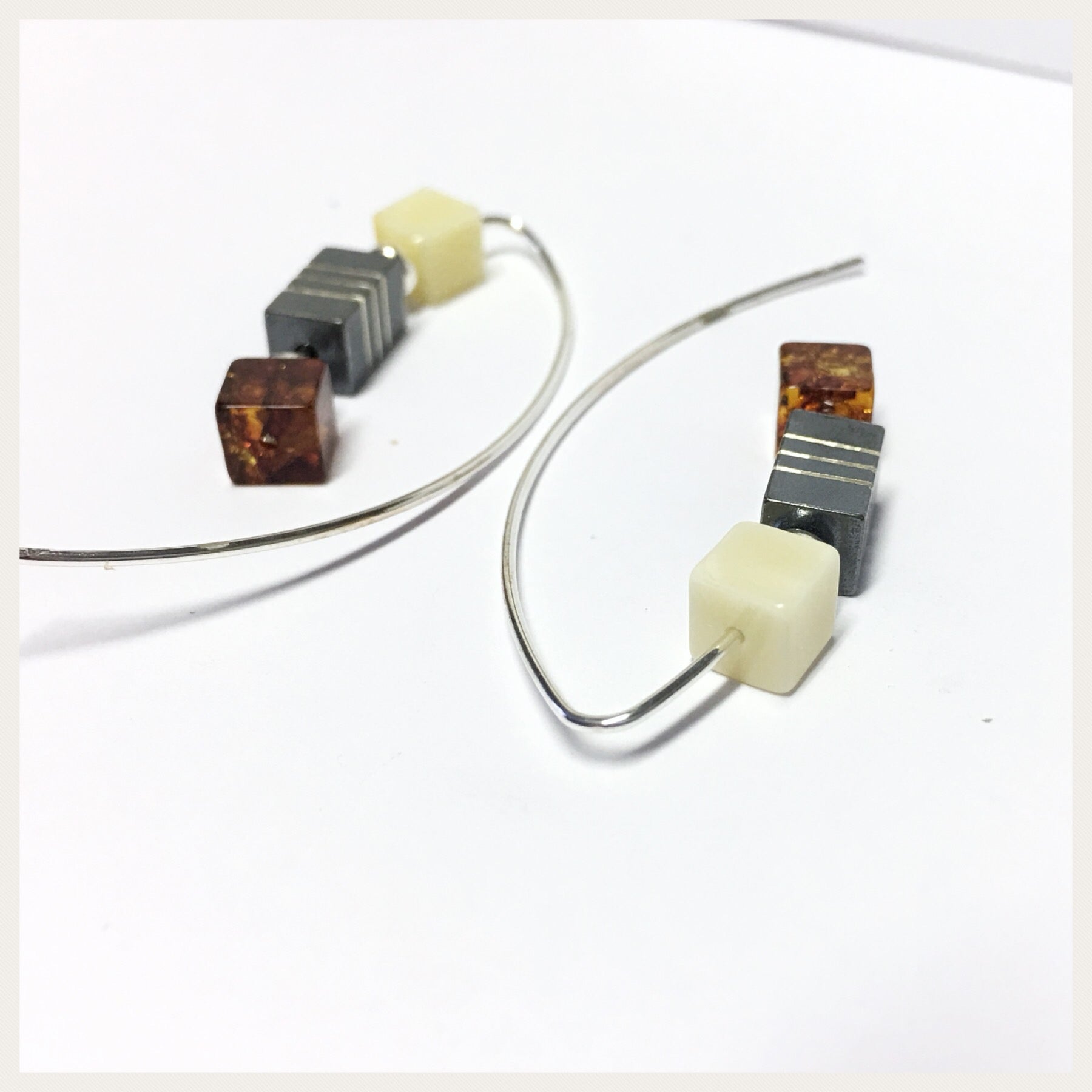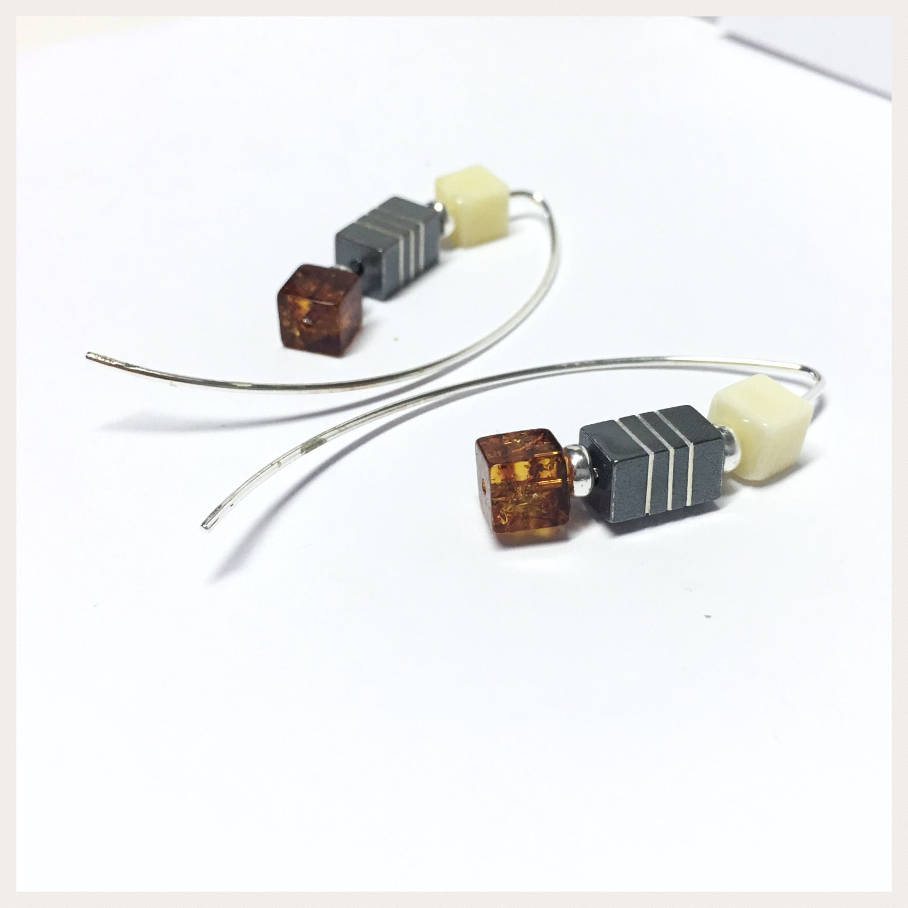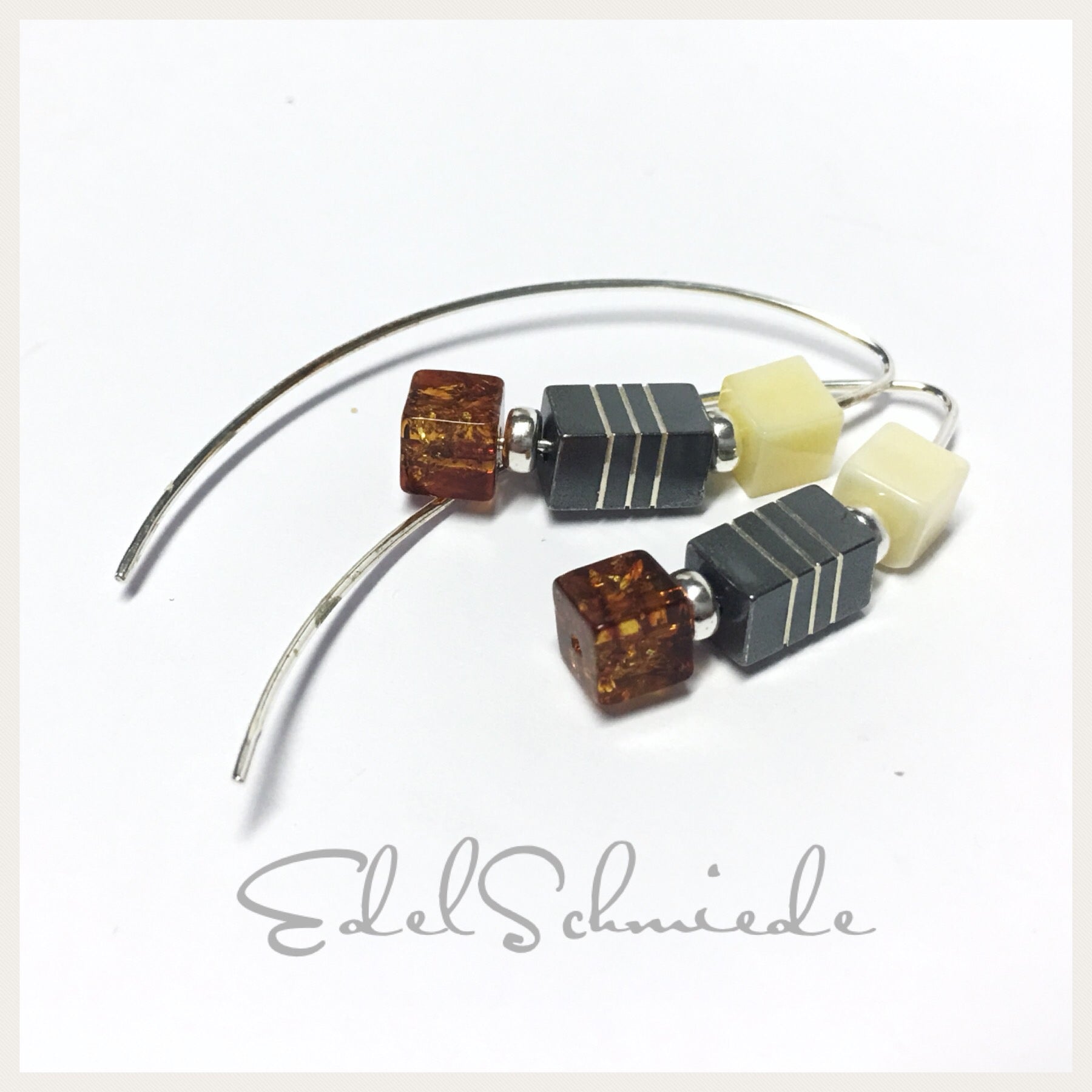Diese modernen Ohrringe sind aus 925/- Sterling Silber gefertigt und bestehen aus einem langen Bügel, der durch das Ohrloch geschoben werden muß. Auf der Vorderseite sind jeweils zwei Bernsteinwürfel (unterschieldicher Farbe) und ein geschwärztes Silberelement aufgefädelt. Bei Kauf erhalten Sie zusätzlich 2 Silikonstopper, die beim tragen ein Herausrutschen verhindern.