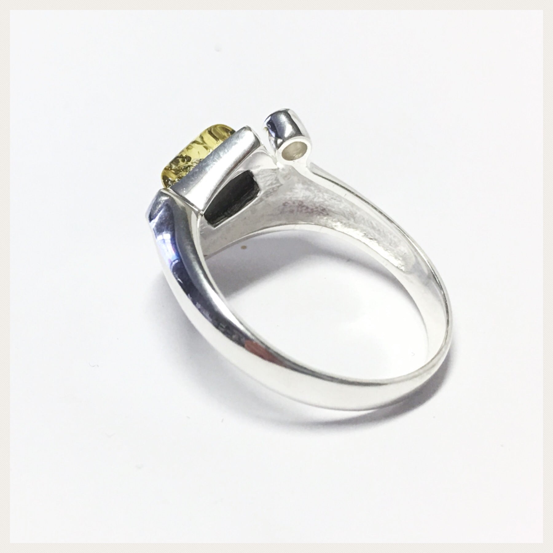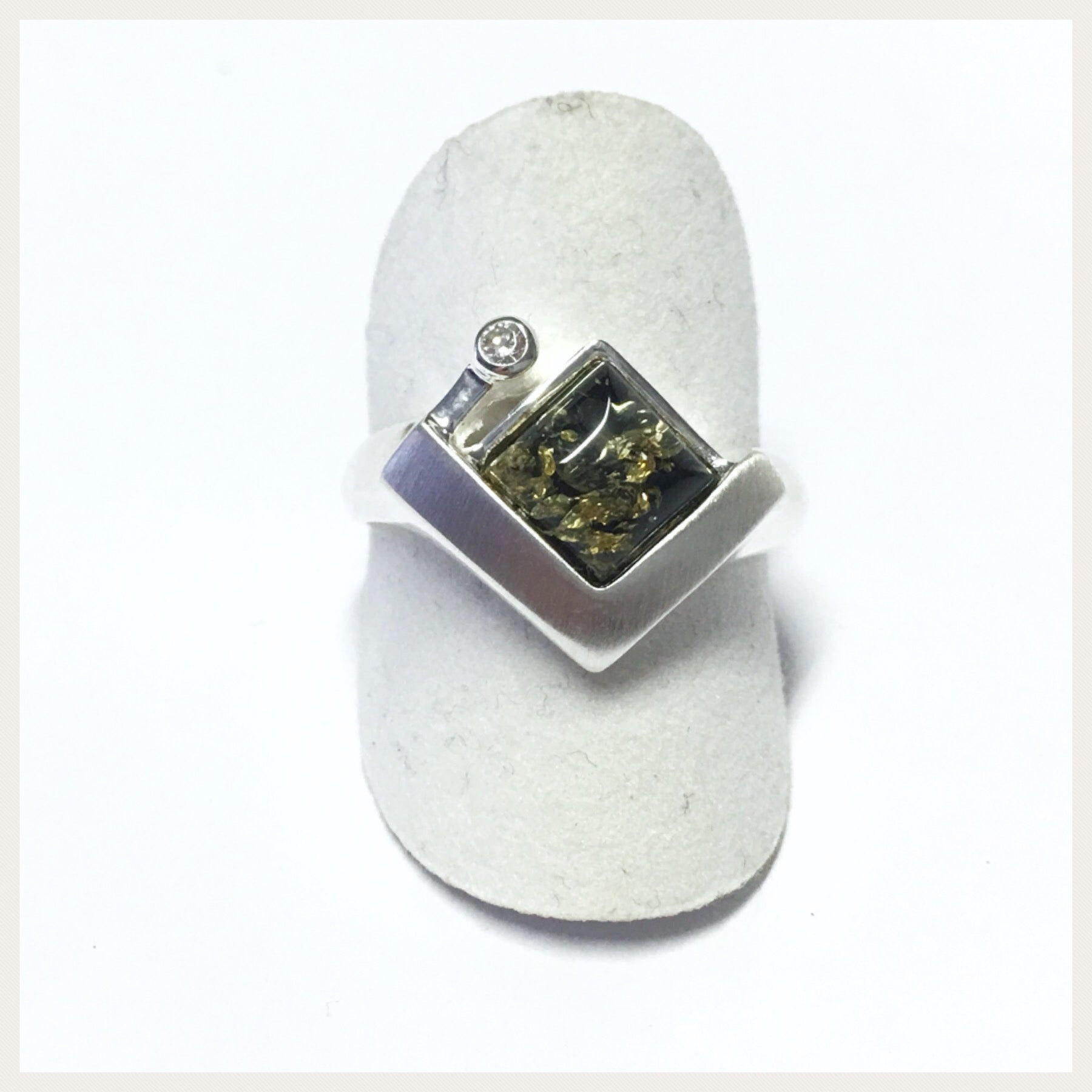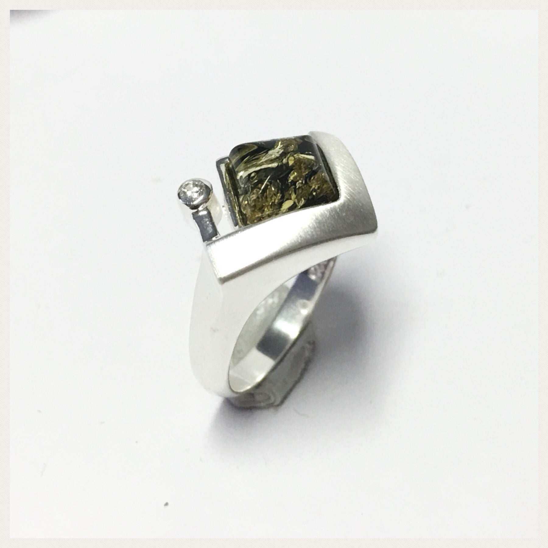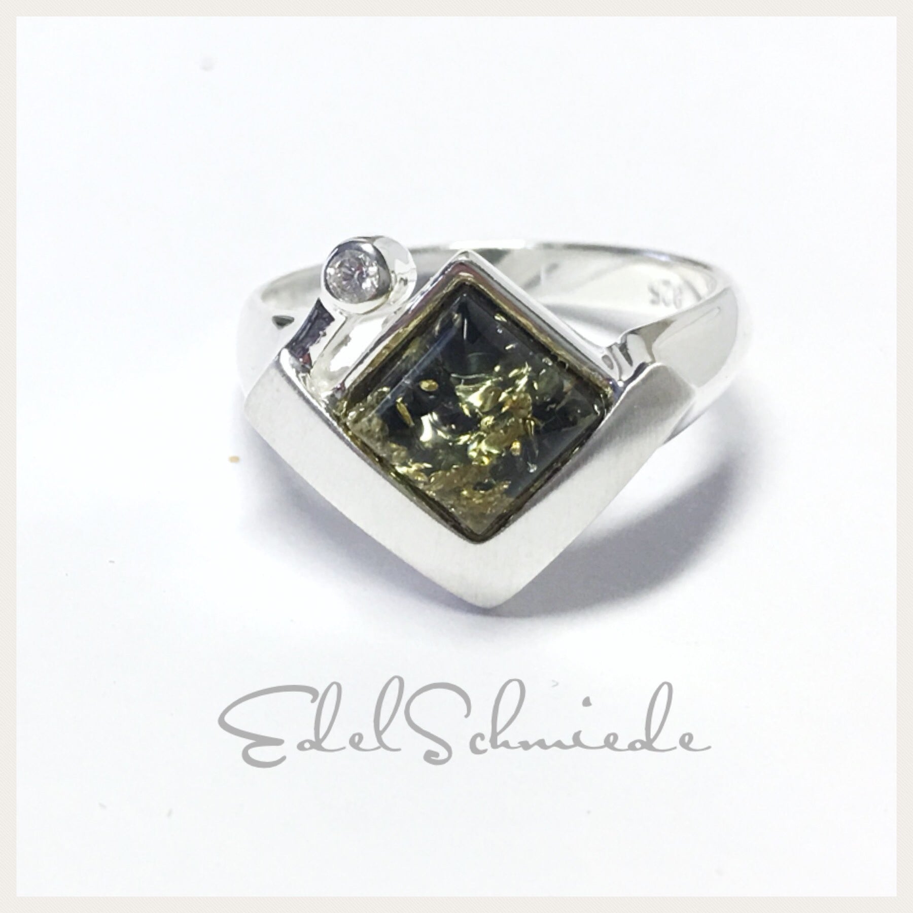 Dieser schlichte Fingerring ist aus 925/- Sterling Silber gefertigt und hat einen wunderschönen und grünen Bernstein integriert. Der stein ist quadratisch und als Cabochon geschliffen. Zusätzlich funkelt ein kleiner gefasster Zirkonia und verleiht dem Ring seinen edlen Look.