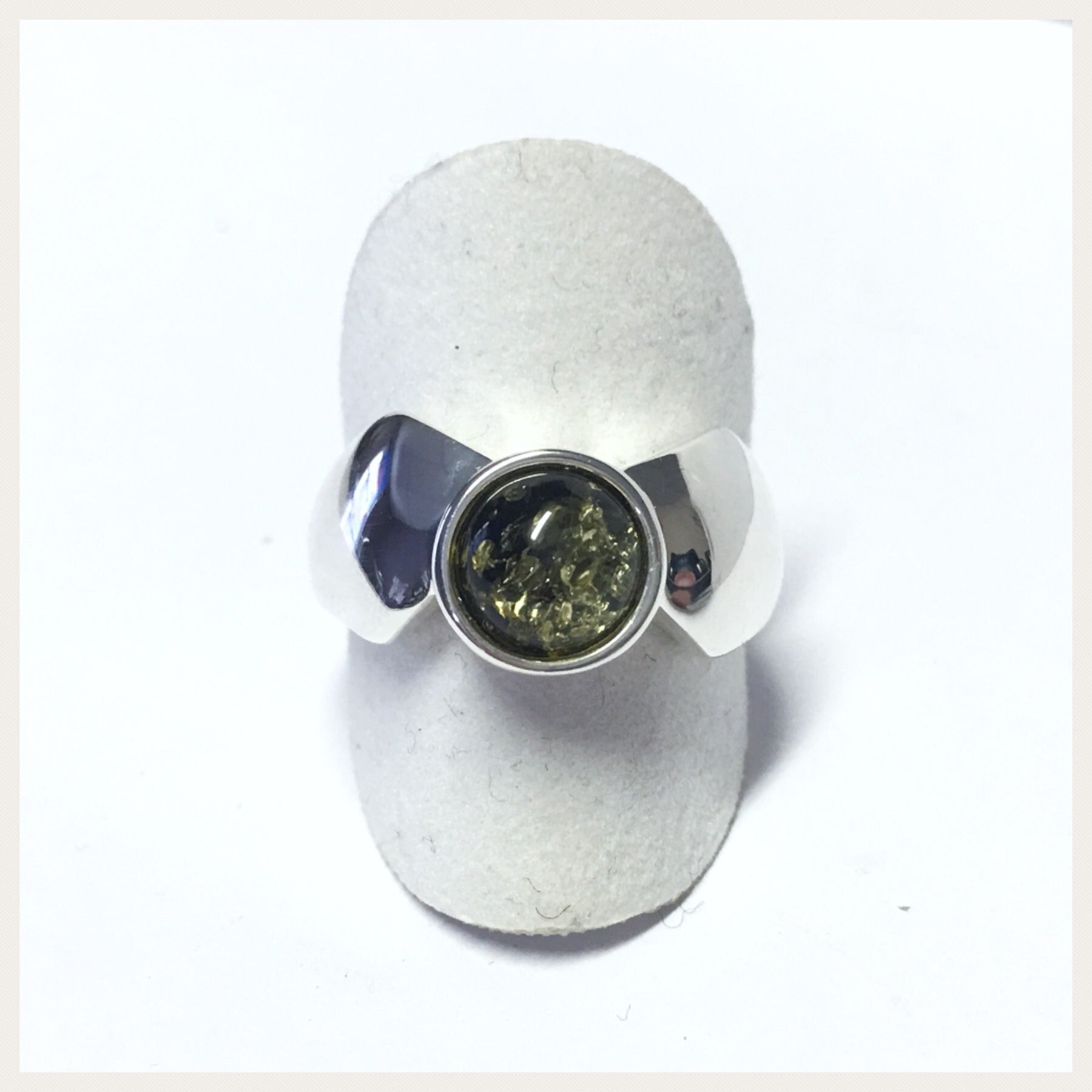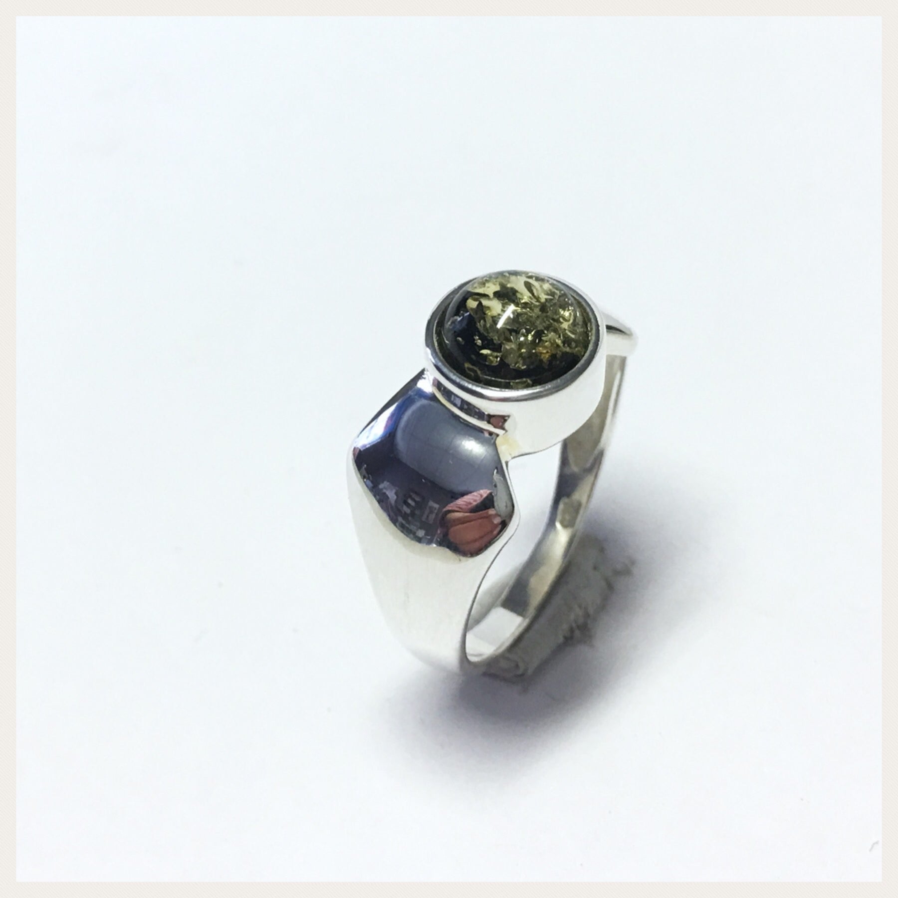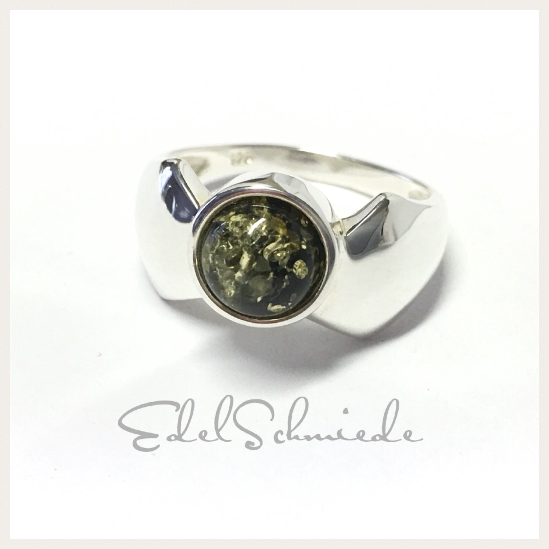 Dieser schlichte Fingerring ist aus 925/- Sterling Silber gefertigt und hat einen wunderschönen und grünen Bernstein integriert. Der stein ist rund und als Cabochon geschliffen.