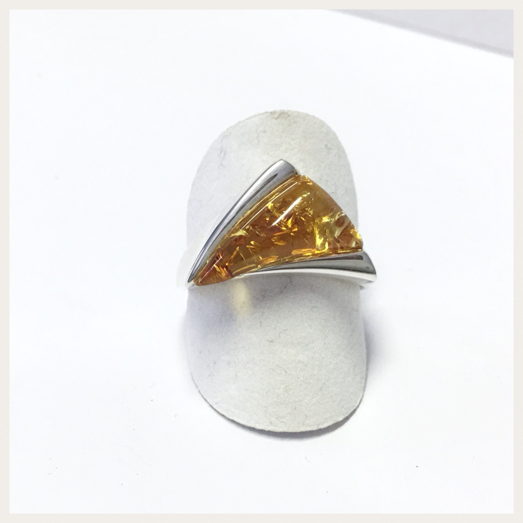 Dieser schlichte Fingerring ist aus 925/- Sterling Silber gefertigt und hat einen wunderschönen und klassisch braunen Bernstein integriert. Der stein hat eine asymmetrisch dreieckige Form.