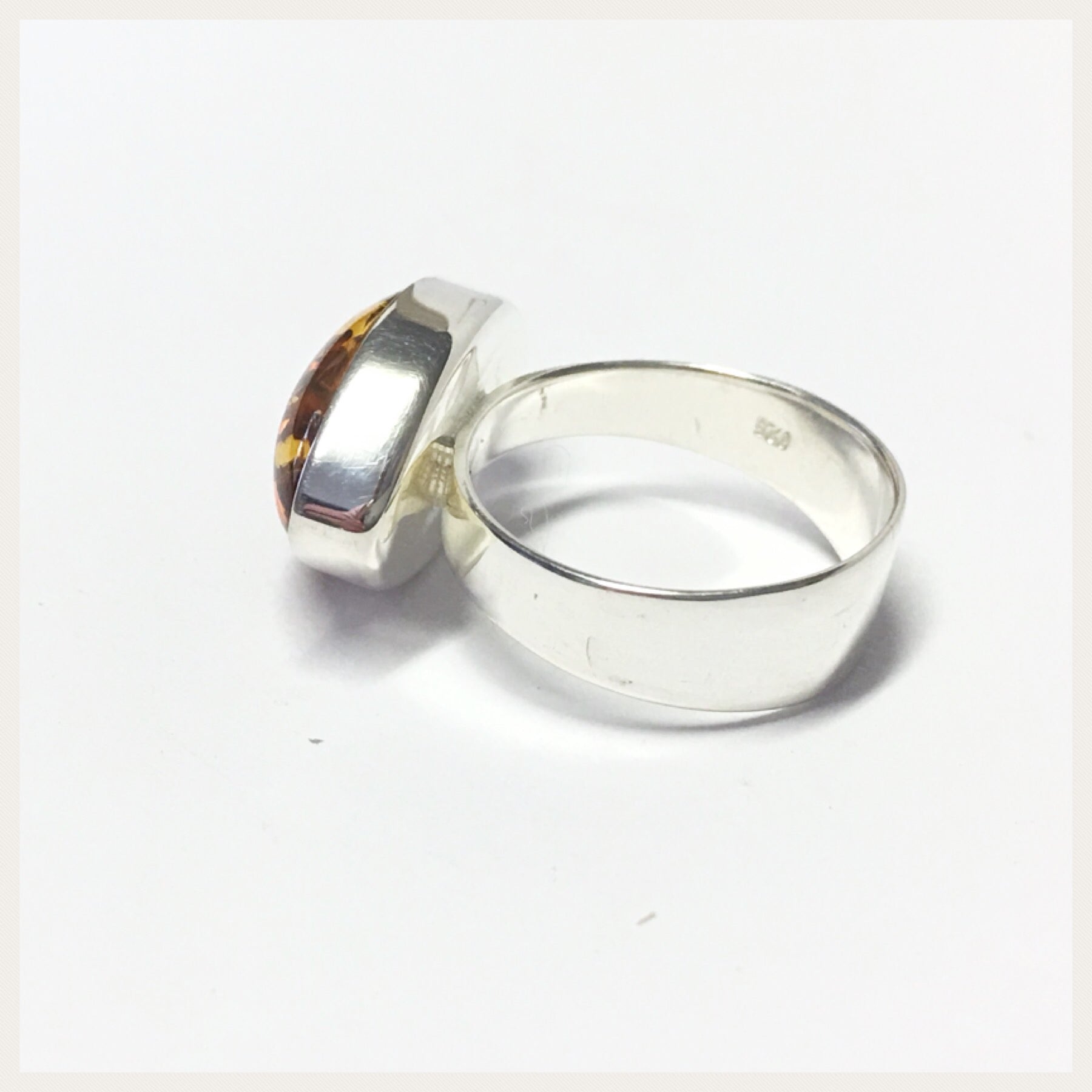 Dieser schlichte Fingerring ist aus 925/- Sterling Silber gefertigt und hat einen wunderschönen und klassisch braunen Bernstein integriert. Der stein hat eine navette Form und ist als Cabochon geschliffen.