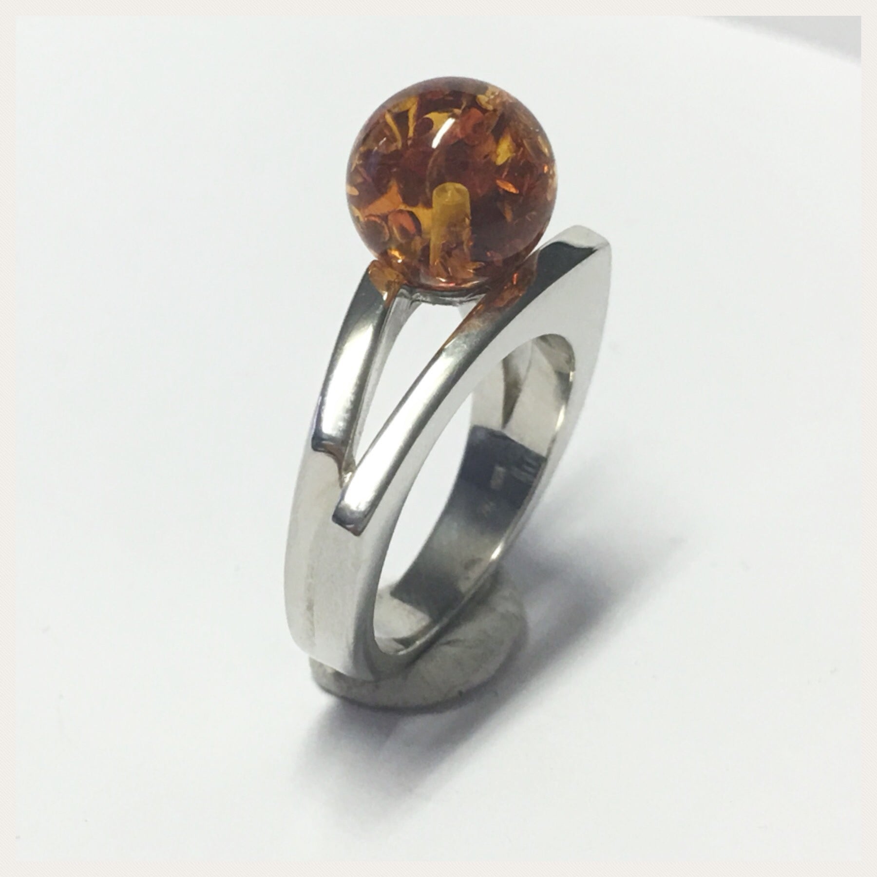 Dieser ausgefallene Fingerring ist aus 925/- Sterling Silber gefertigt und wurde abschließend, als Anlaufschutz, rhodiniert. Er hat einen wunderschönen und klassisch braunen Bernstein integriert. Der Stein ist als Kugel geschliffen und sitzt asymmetrisch im Ringkopf, da sich optisch die Schiene zu teilen versucht.