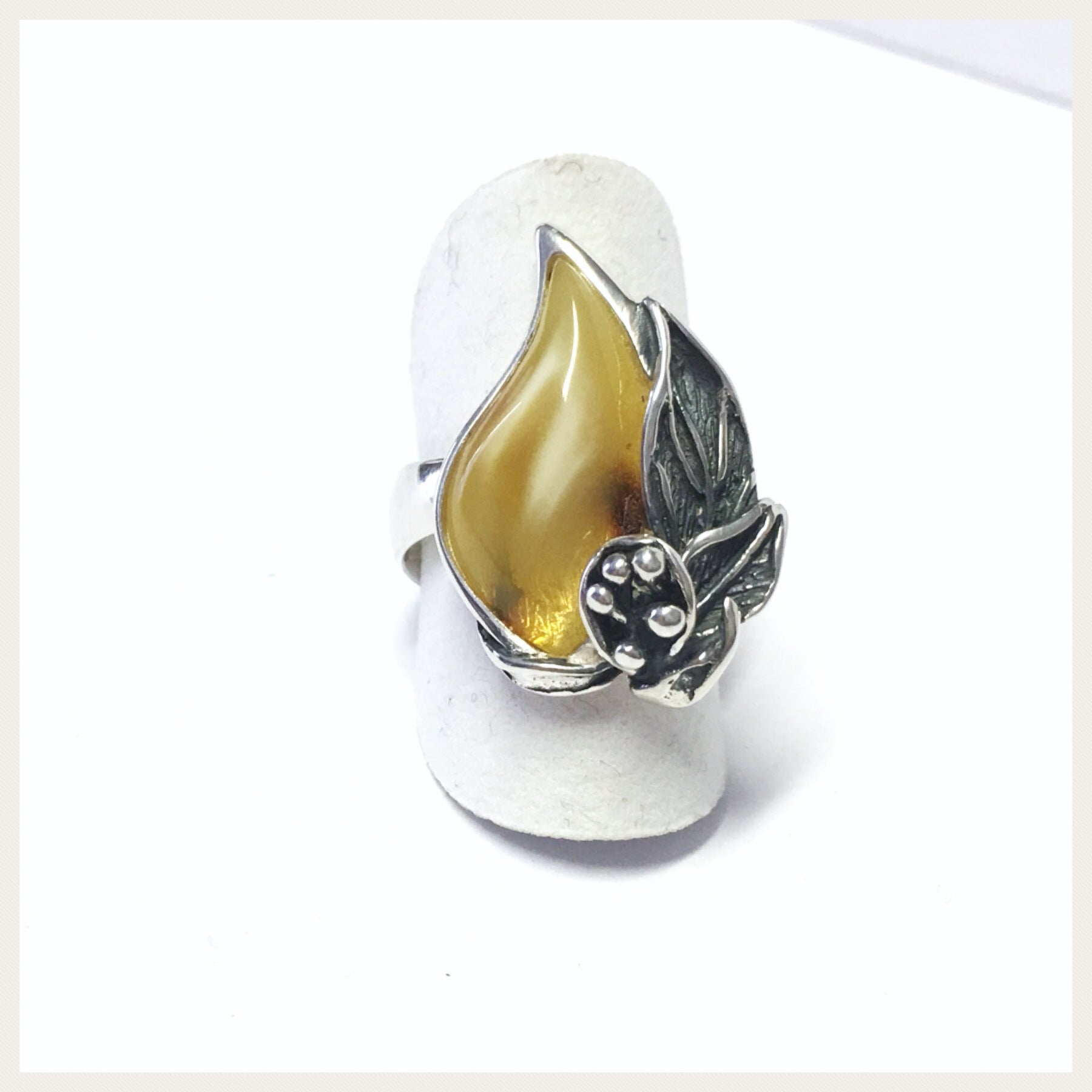 Dieser schlichte Fingerring ist aus 925/- Sterling Silber gefertigt und hat einen wunderschönen und gelblich - milchigen Bernstein integriert. Der stein hat eine asymmetrisch dreieckige Form, die leicht in sich geschwungen ist. Der Ringkopf ist mit zusätzlichen Elementen verzeihrt, die leicht geschwärzt sind, um einen antiken Look zu erreichen.