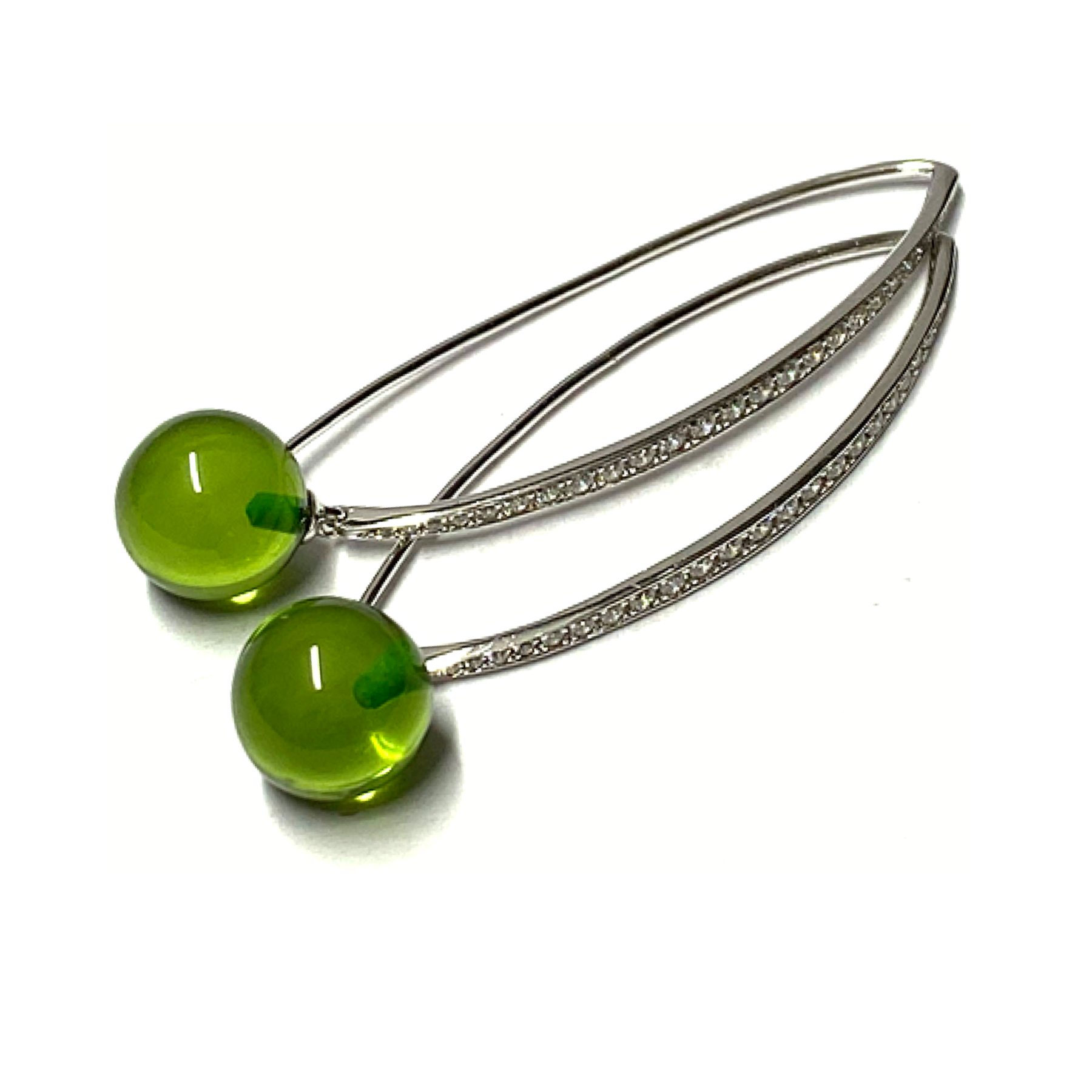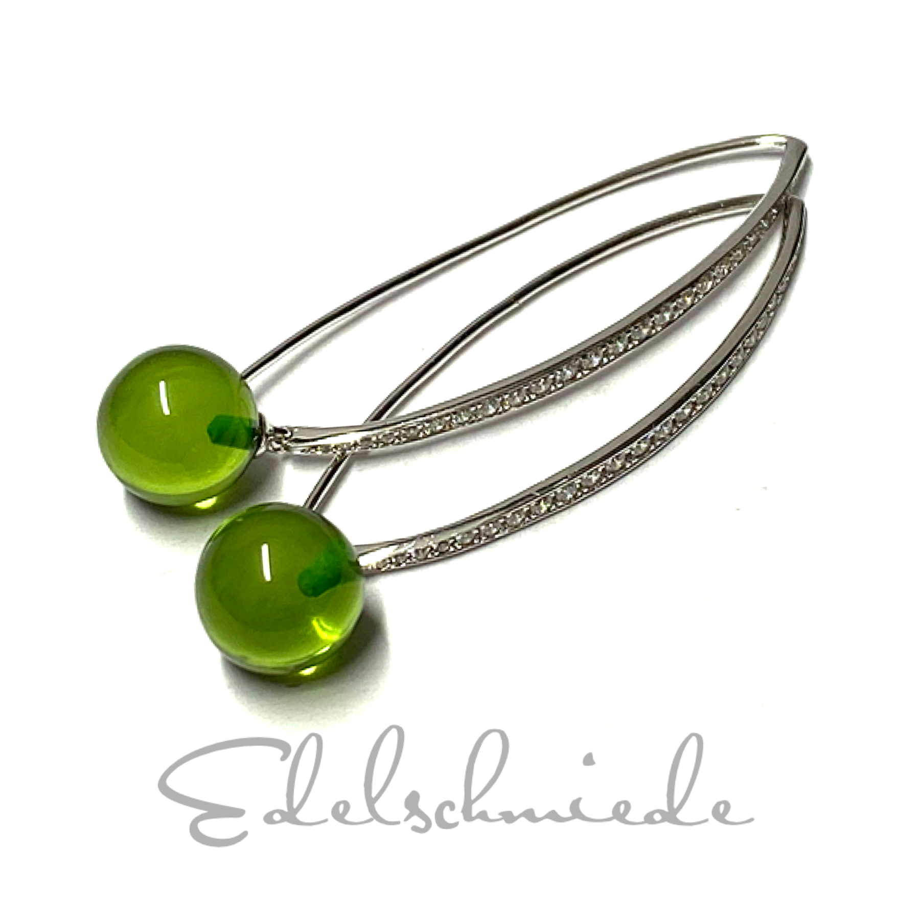 Diese Ohrstecker sind aus 925/- Sterling Silber gefertigt und wurden abschließend, als Anlaufschutz, rhodiniert. Sie tragen einen herrlich grünen karibischen Bernstein in sich. Die Farbe bekommt der Bernstein allein durch den einmaligen Fundort. Der Edelstein ist als Kugel geschliffen und beweglich unterhalb des Ohrhängersteges angebracht. Zusätzlich befinden sich in dem Steg funkelnde Zirkonias, die dem Ohrschmuck einen edlen Touch verleiht. Bei Kauf erhalten Sie 2 Silikonstopper, die das Herausrutschen der Ohrhänger verhindern sollen.