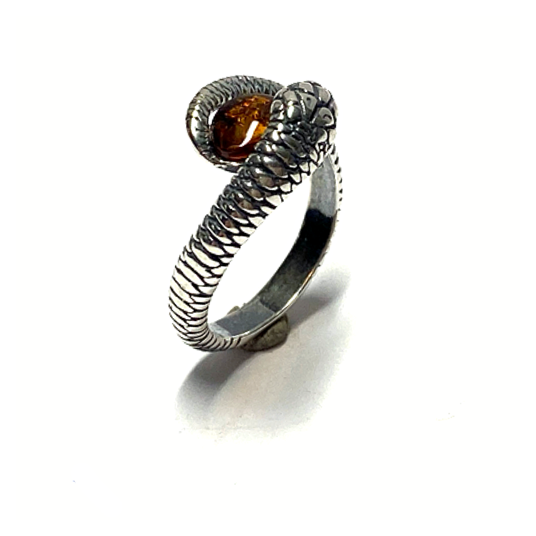 Dieser wunderschöne Fingerring ist aus 925/- Sterling Silber gefertigt und wurde abschließend, als Anlaufschutz, rhodiniert. Er hat einen kleinen ovalen Bernstein aufgesetzt. Der Stein hat eine typische braune Farbe und einige deutlich sichtbare Einschlüsse. Die Besonderheit liegt bei diesem Ring ist die Schlangenoptik. Es scheint als windet sich eine Schlange um den Finger und beschützt den Bernstein. Die Oberfläche ist dezent geschwärzt worden, damit ein rustikaler Look entsteht.