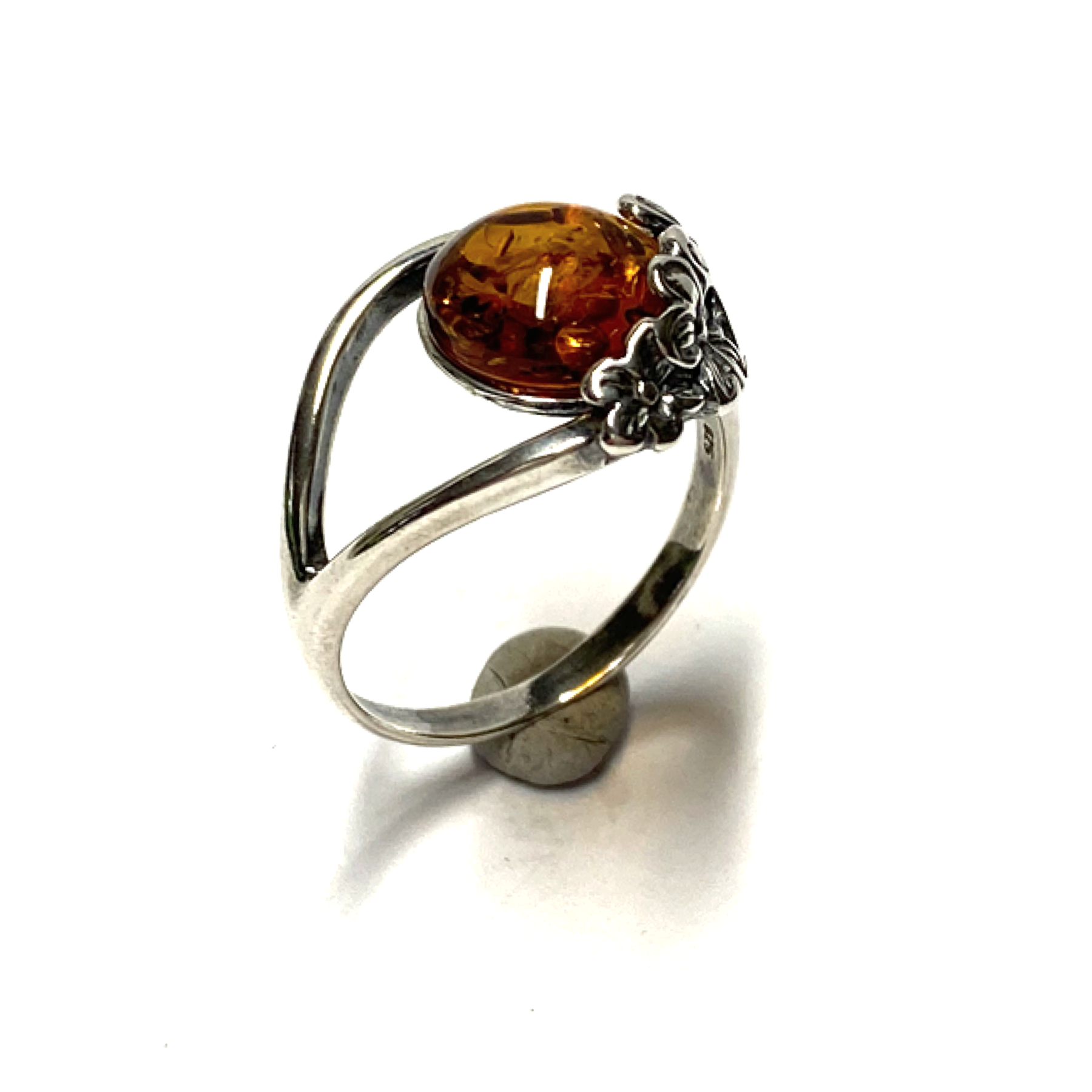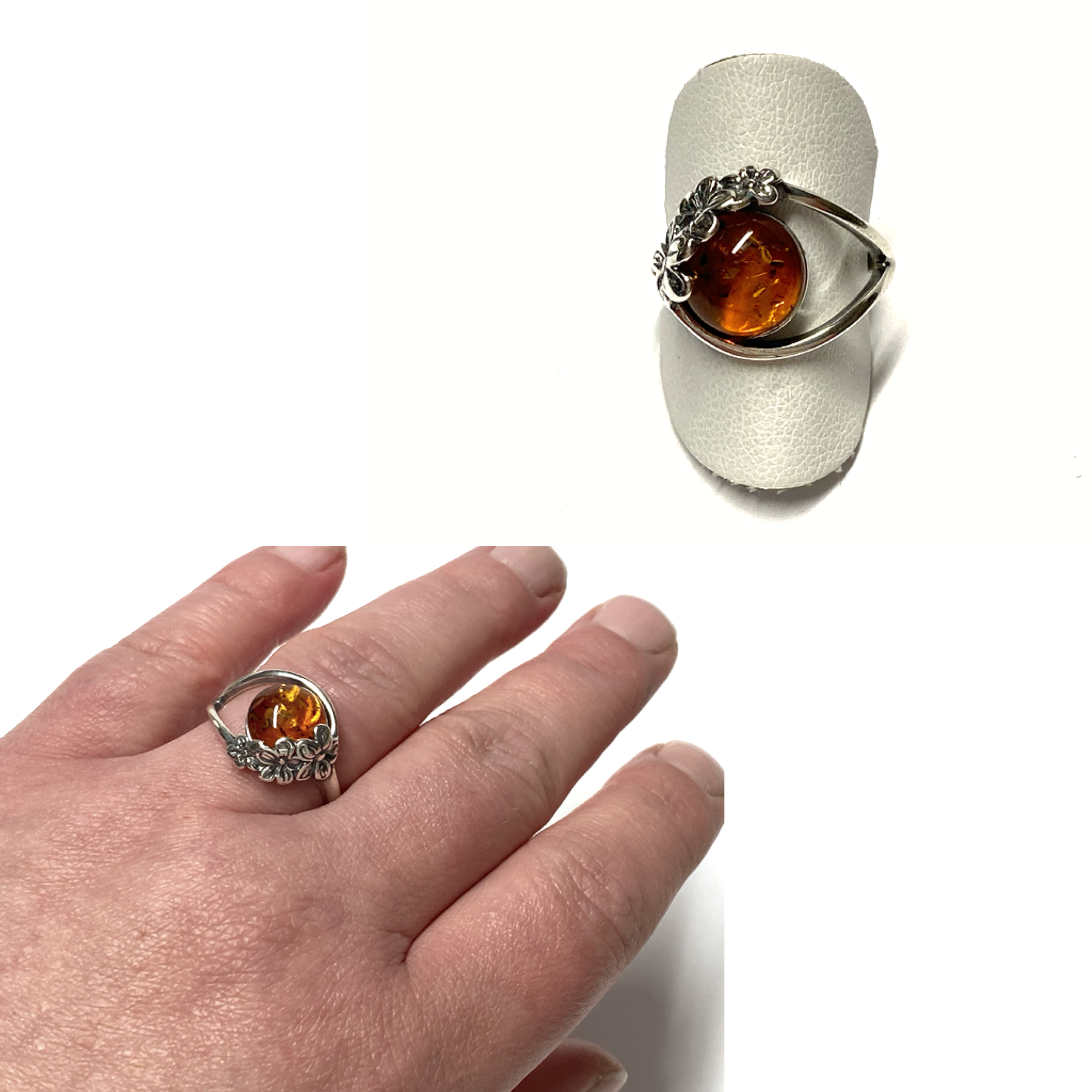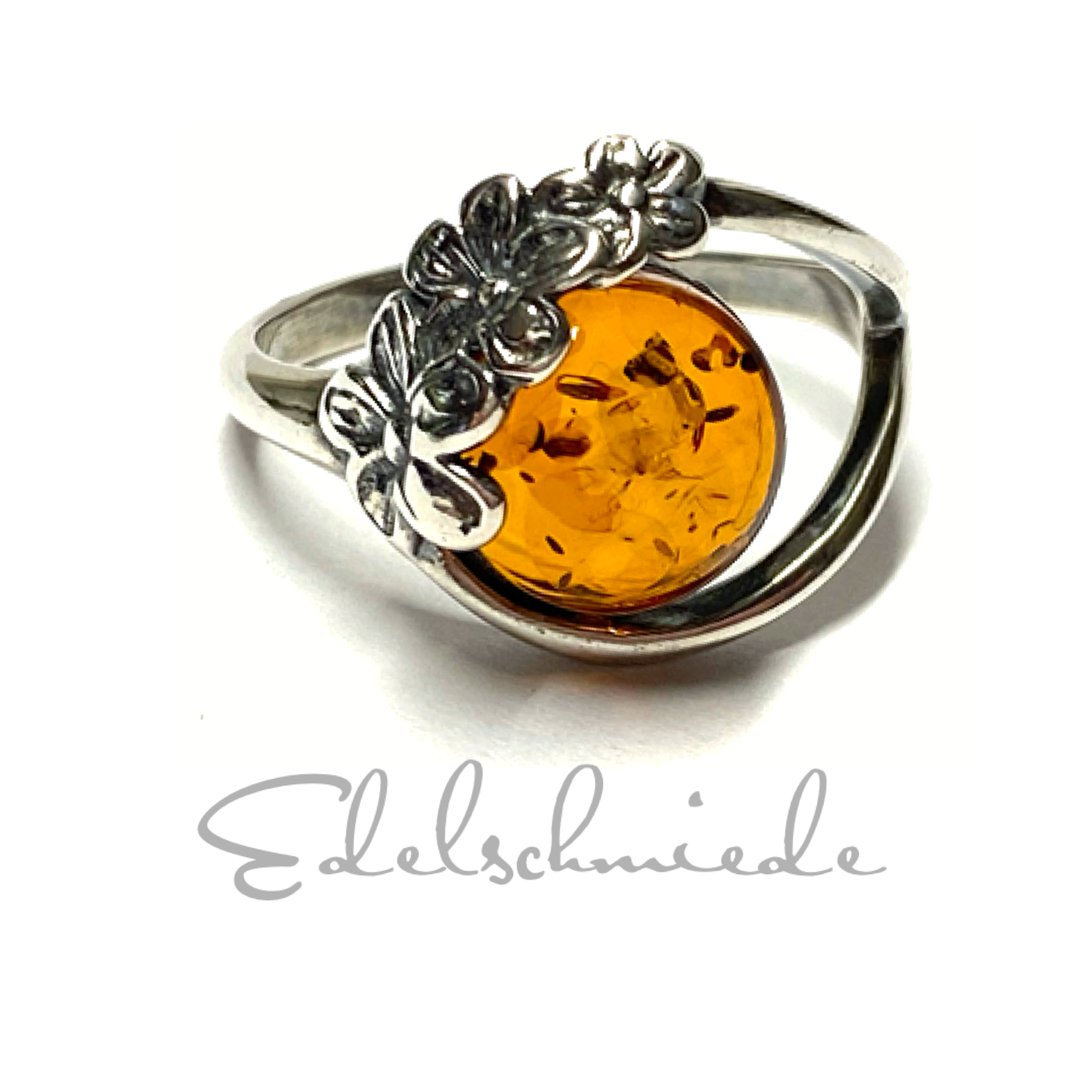 Dieser wunderschöne Fingerring ist aus 925/- Sterling Silber gefertigt und wurde abschließend, als Anlaufschutz, rhodiniert. Er hat einen großen runden Bernstein aufgesetzt. Der Stein hat eine typische braune Farbe und einige deutlich sichtbare Einschlüsse. Die Besonderheit liegt bei diesem Ring bei den kleinen dezenten Blüten, die Rings um den Stein angebracht sind. Sie gibt einen herrlichen Kontrast zum Braun des Steines und ist leicht antik geschwärzt.